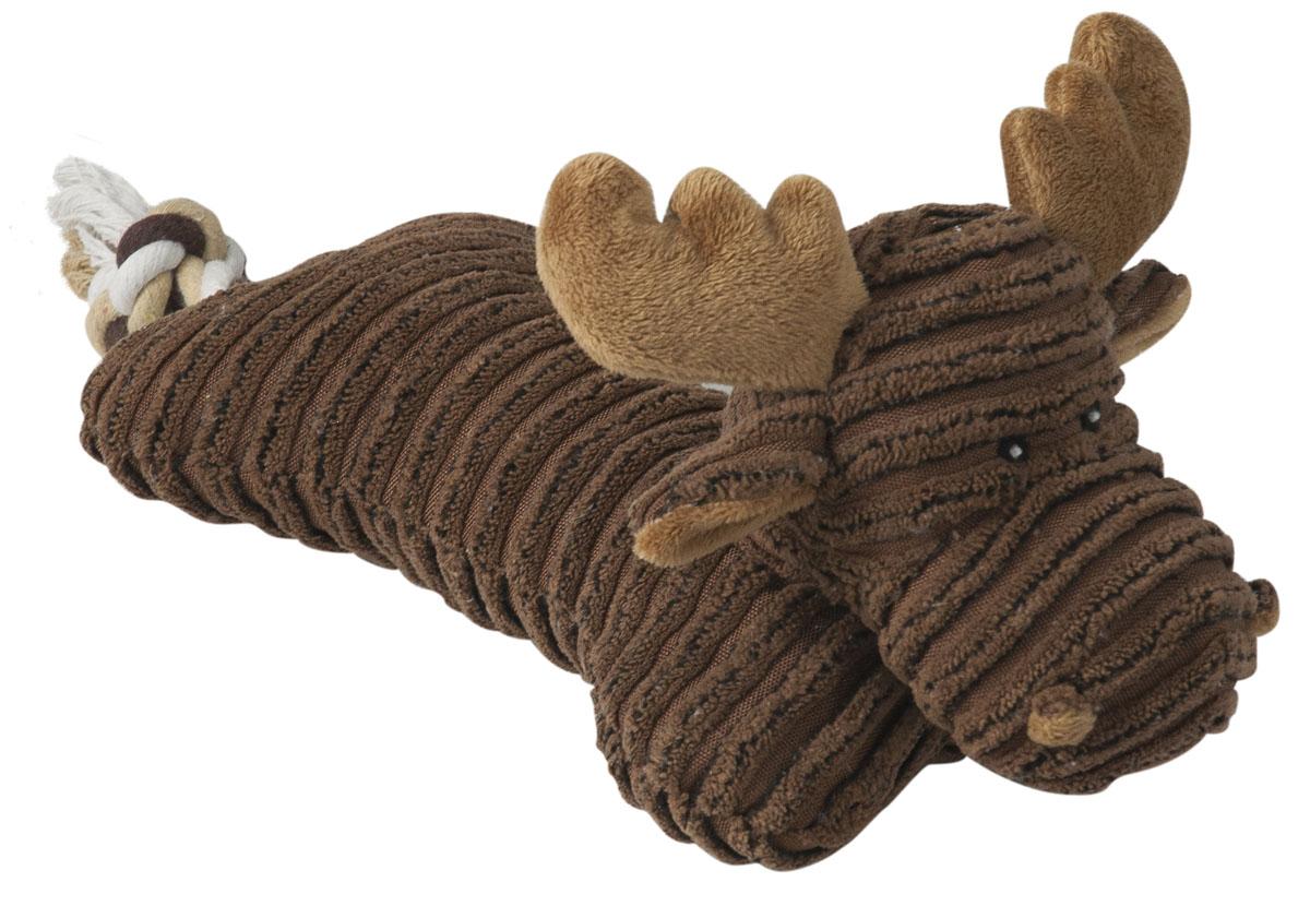 Alce de peluche con forma de almohada elaborado con un tejido suave y confortable. Es ideal para fortalecer su mandíbula y sus dientes mientras juega. Hace un peculiar y gracioso sonido que atraerá su atención.