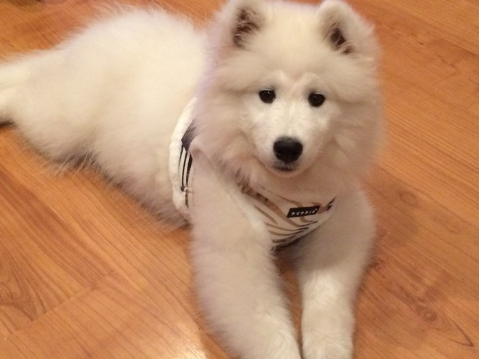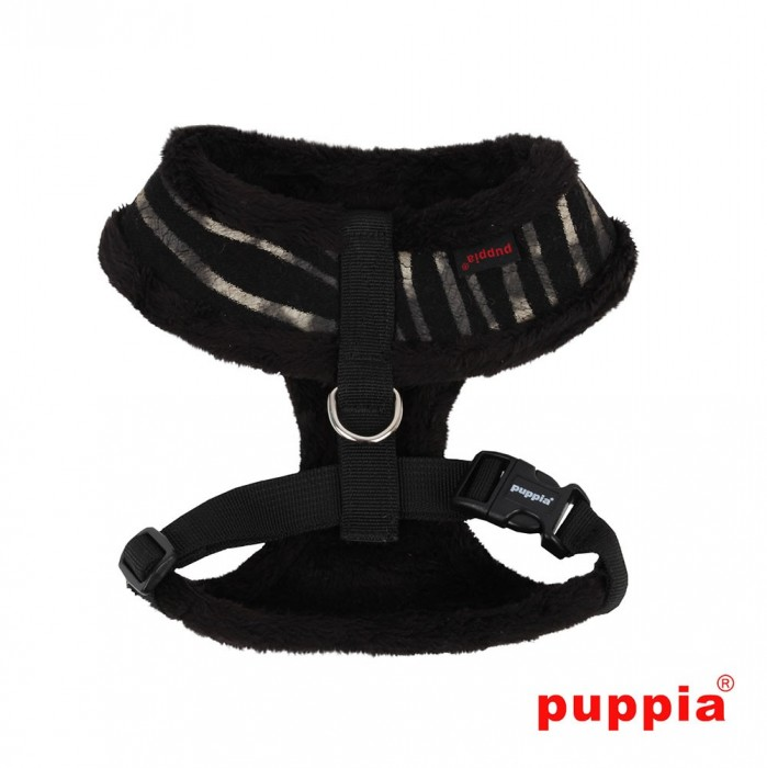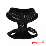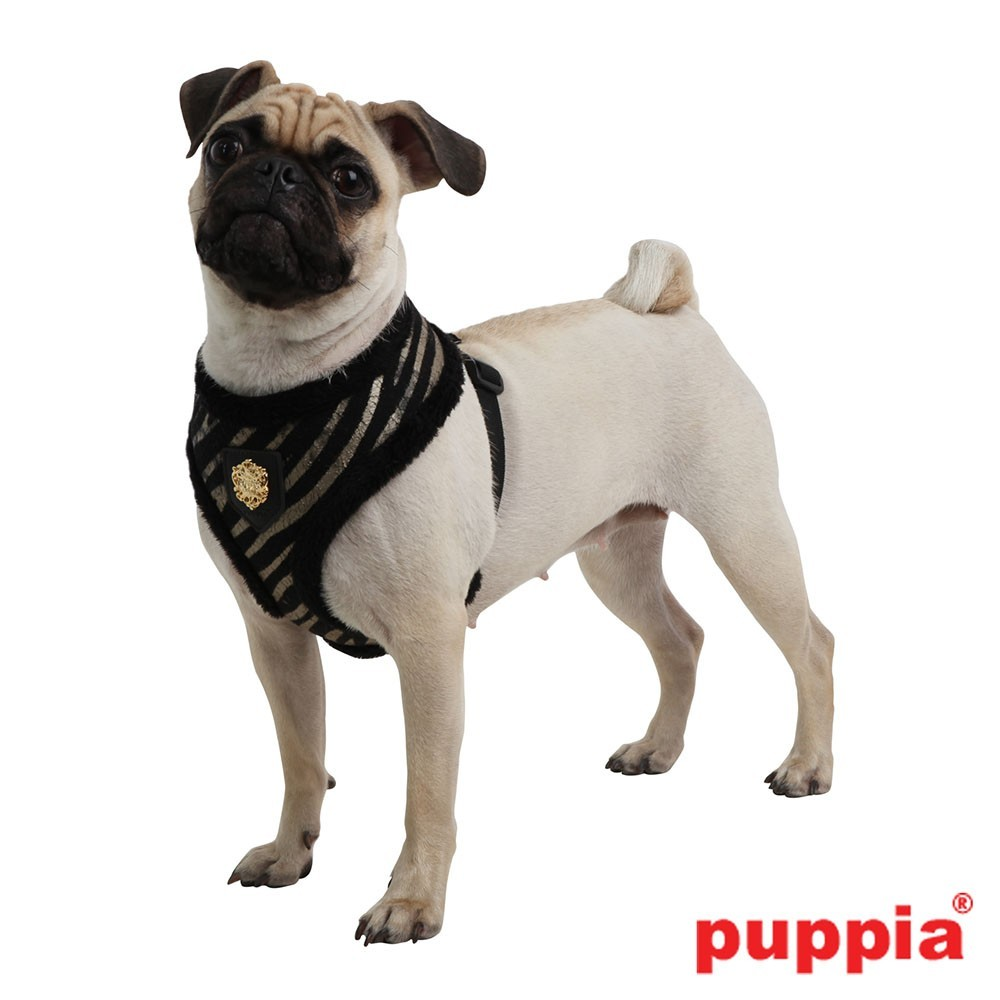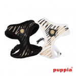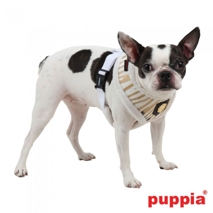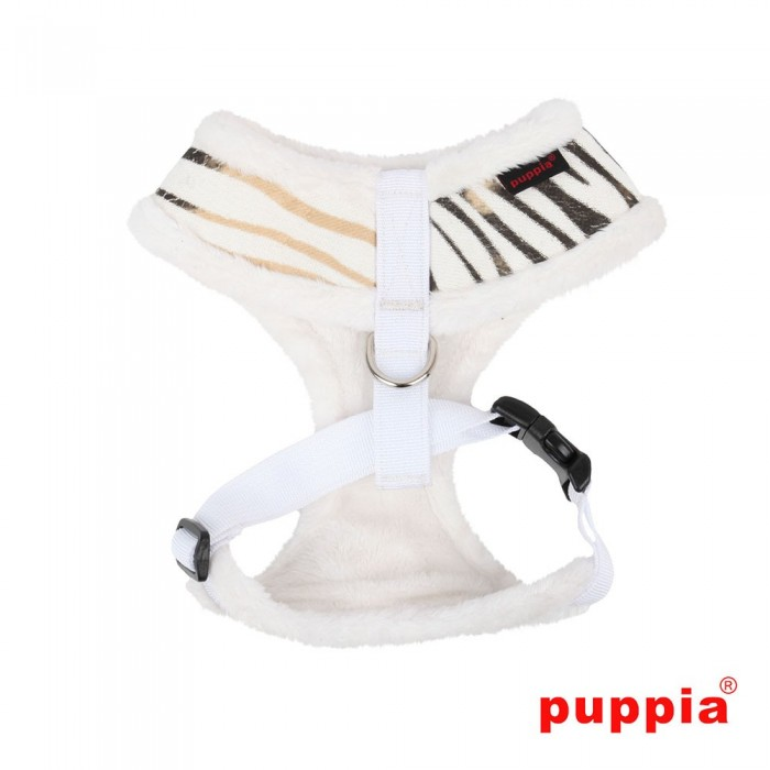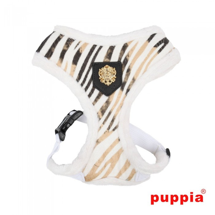 El arnés Big Dog Polar de Puppia tiene un estampado de cebra y está acolchado. En el frontal lleva el emblema de Puppia.