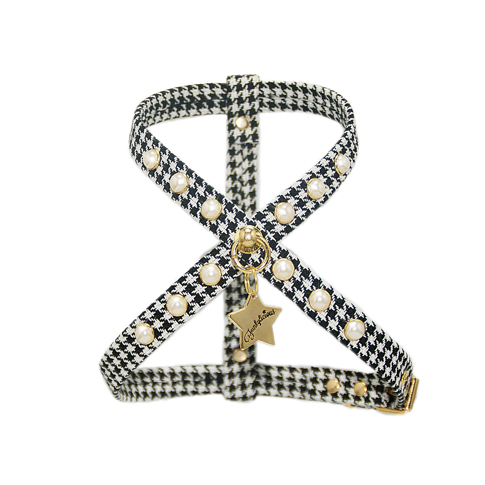 El arnés Coco de Funkylicious está realizado en tejido con el clásico estampado atemporal “pata de gallo”, esto junto con sus medias perlas remachadas hacen un conjunto de lo mas chic para damitas con mucha clase.