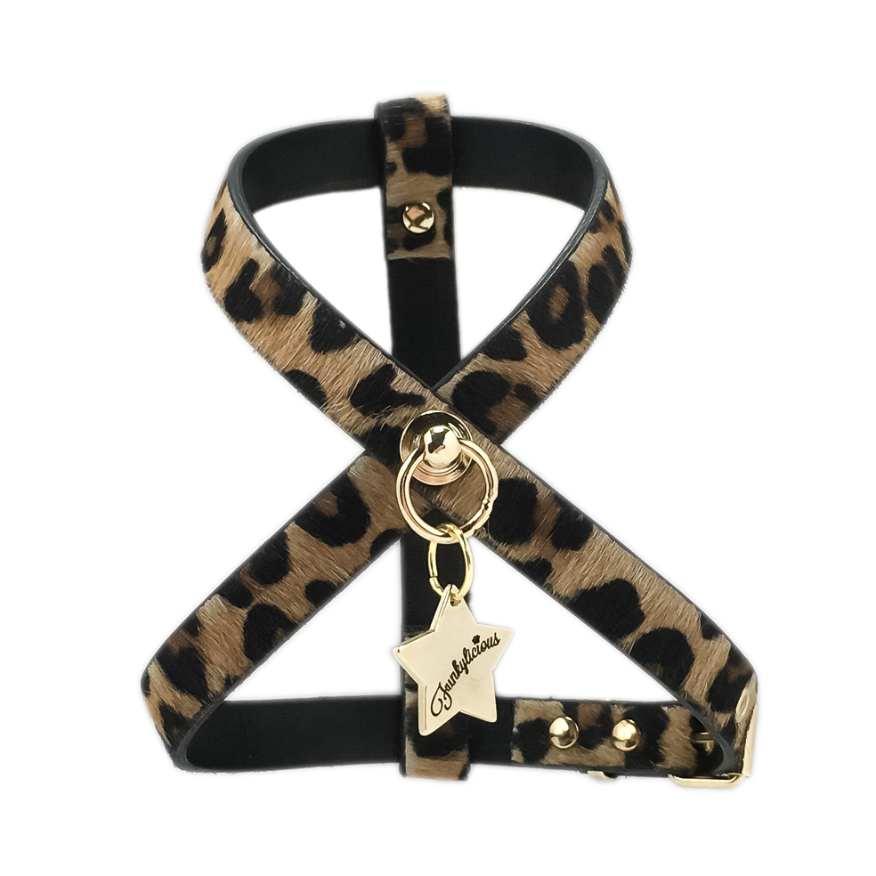 El arnés Dakar está realizado con piel de vaca con pelo estampado de leopardo y reverso sintético negro.