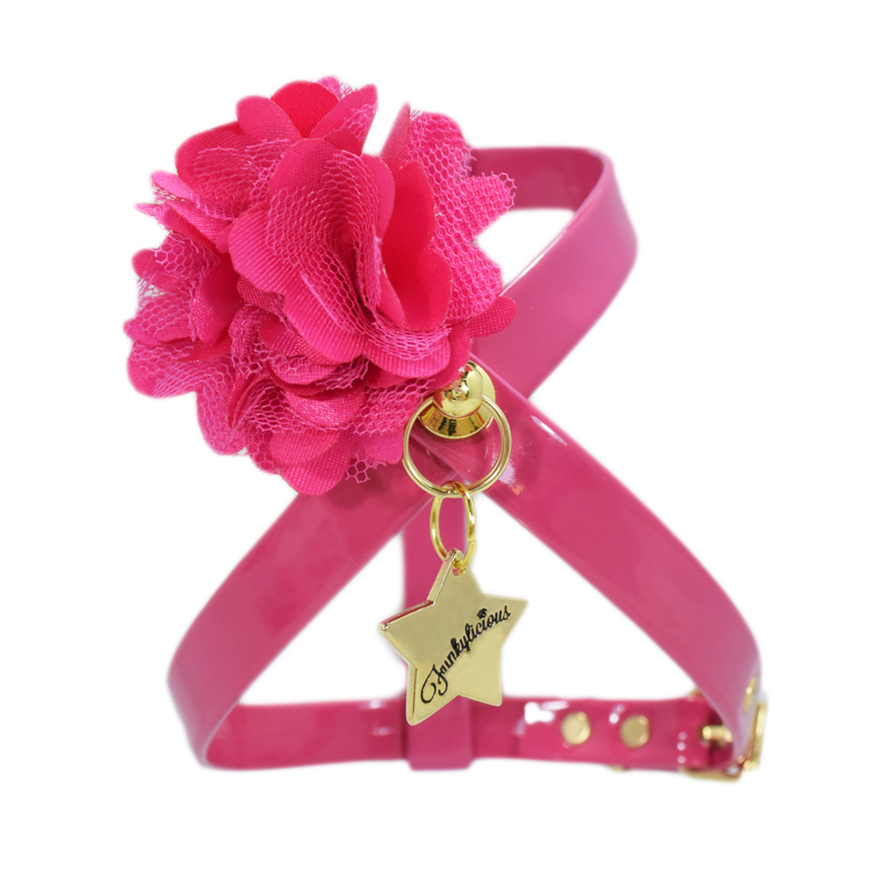 El arnés Flower fresa está realizado en tira de charol sintético de 13mm y decorado con una delicada flor de satén. Fino y elegante para cualquier día y cualquier ocasión.