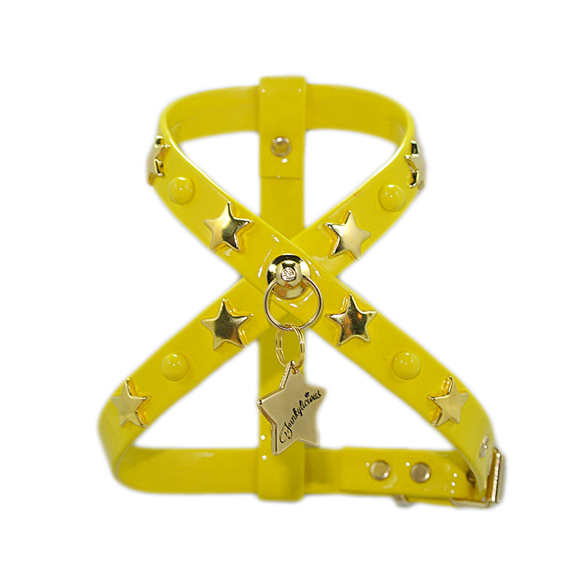 El arnés Majestic de Funkylicious está realizado en charol de 13mm decorado con estrellas doradas y pequeñas pecas acrílicas del mismo tono que el arnés. Para adictos a las estrellas.