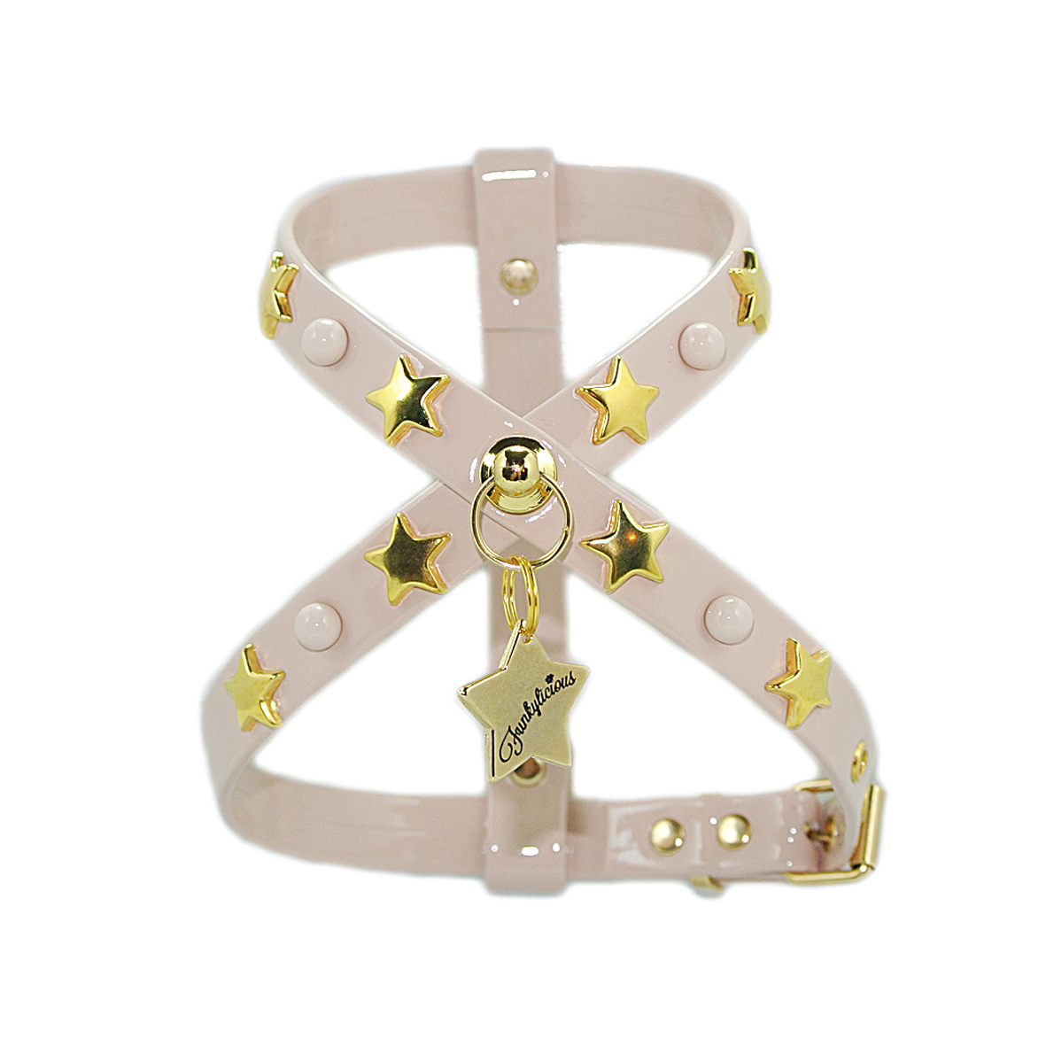 El arnés Majestic de Funkylicious está realizado en charol de 13mm decorado con estrellas doradas y pequeñas pecas acrílicas del mismo tono que el arnés. Para adictos a las estrellas.