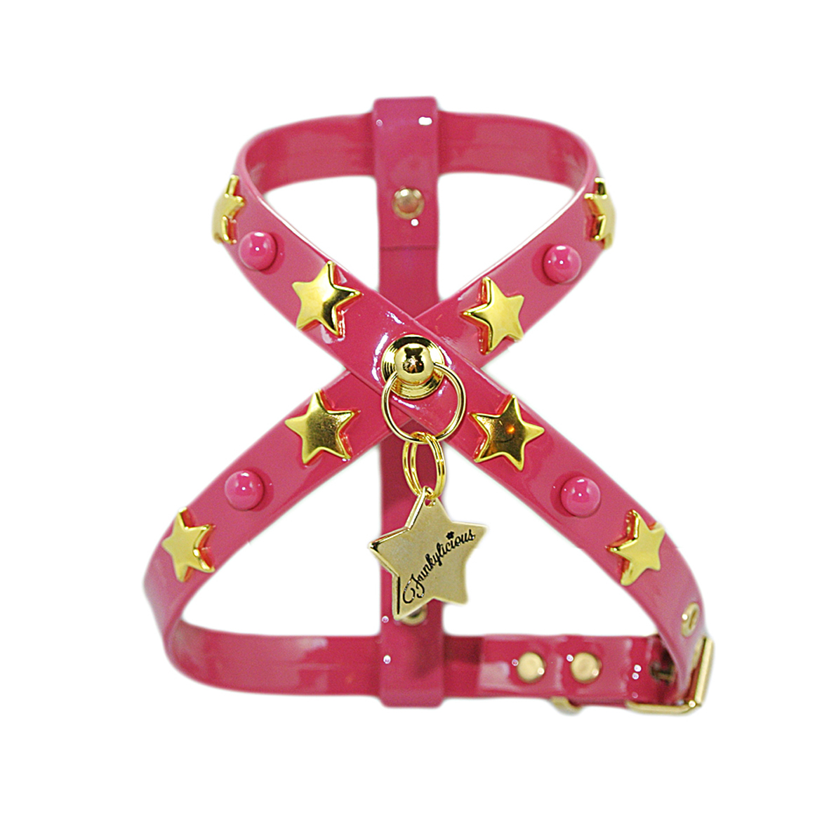 El arnés Majestic de Funkylicious está realizado en charol de 13mm decorado con estrellas doradas y pequeñas pecas acrílicas del mismo tono que el arnés. Para adictos a las estrellas.