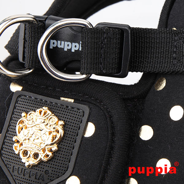 El arnés Modern Dotty de Puppia diseño elegante con el estampado de lunares brillantes. Esta disponible en color beige y azul marino. Gracias a su cómodo diseño no crea ninguna tensión en el cuello. Lleva un sello de goma y cierre seguro con velcro.