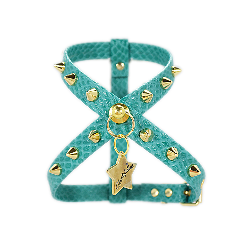 El arnés Punk Snake turquesa está realizado en tira de eco-piel grabada de serpiente de 13mm decorado con pinchitos acrílicos dorados.