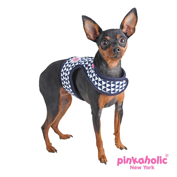 El arnés Xena de Pinkaholic de tipo chaleco tiene un estampado geometrico con triangulitos. Se cierra con un velcro en la zona del cuello y otro en la zona de la barriguita. Decorado con un sello de goma de Pinkaholic.
