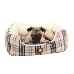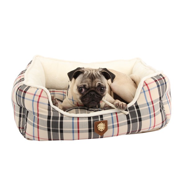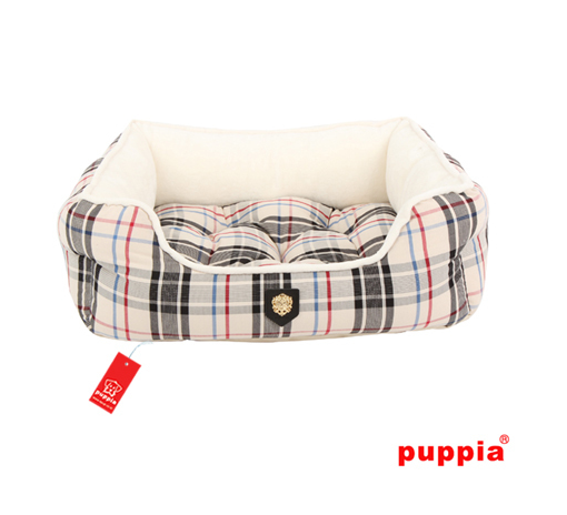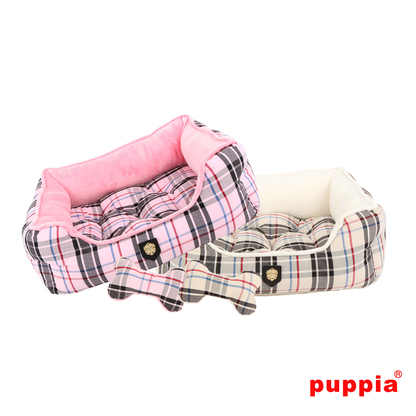 Preciosa cama de la marca Puppia disponible en color beige. Tiene un estampado muy elegante. El cojín es reversible y lavable. Incluye un juguete en forma de hueso con el mismo estampado que la cama.