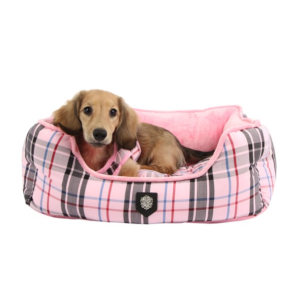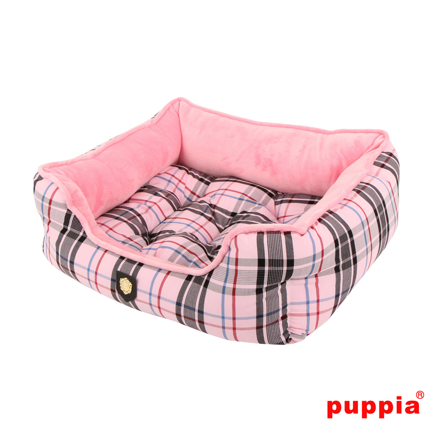 Preciosa cama de la marca Puppia disponible en color rosa. Tiene un estampado muy elegante. El cojín es reversible y lavable. Incluye un juguete en forma de hueso con el mismo estampado que la cama.
