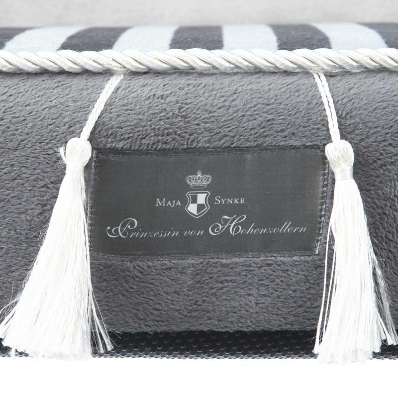 Cama redonda My Prince. Funda de peluche de pelo corto. Relleno de gomaespuma. Acolchado. Con elegante bordado de la colección My Prince y cordón decorativo con borlas. Base de nylon antideslizante. Lavable a mano hasta 30ºC. Funda del cojín lavable a máquina hasta 30ºC.