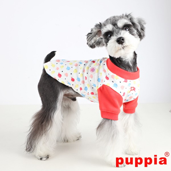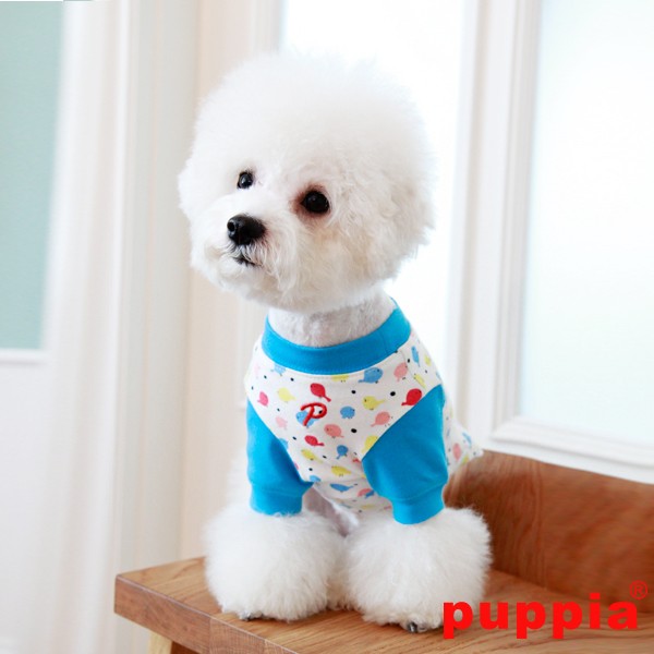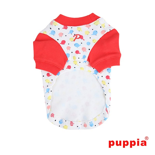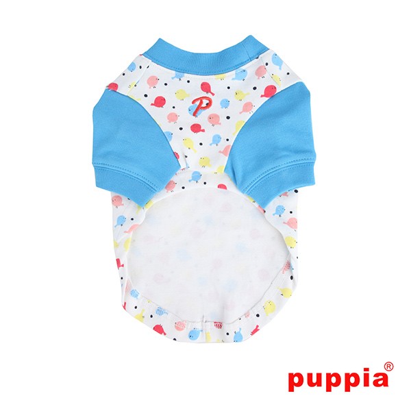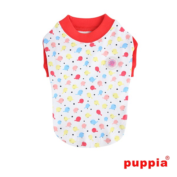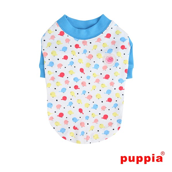 Camiseta de la marca Puppia con estampado de pajaritos. Perfecta para ir a dar un paseo al parque y que todos los ojos se posen en él.