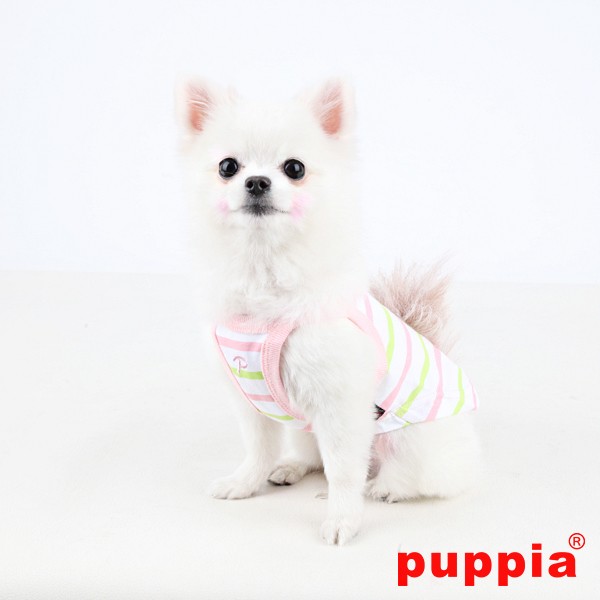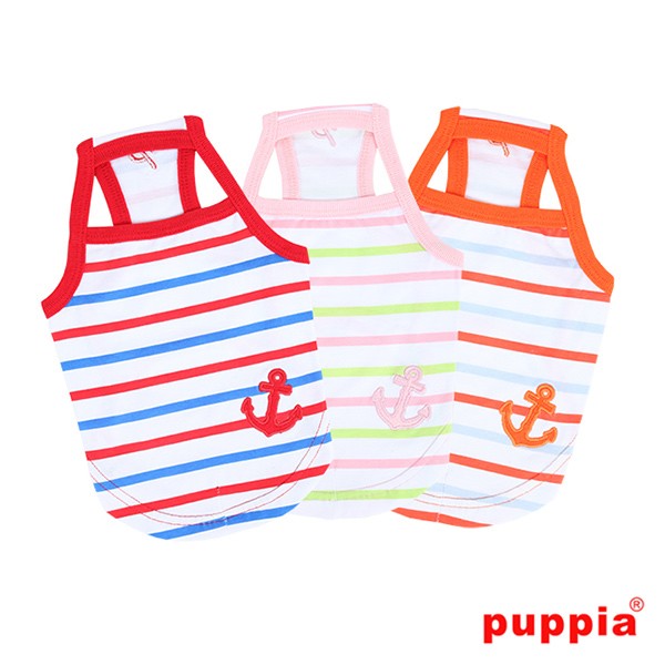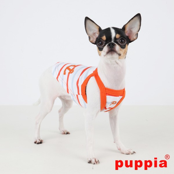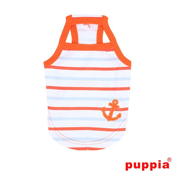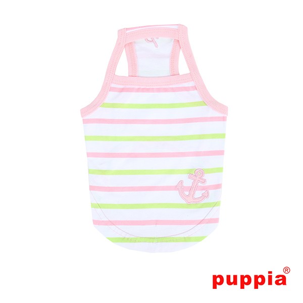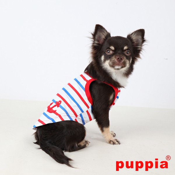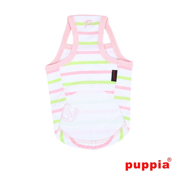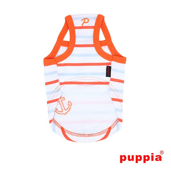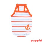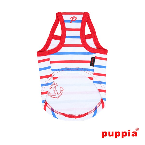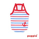 Preciosa camiseta de la marca Puppia con estampado a rayas. Decorada con un ancla bordada en la parte de atrás.