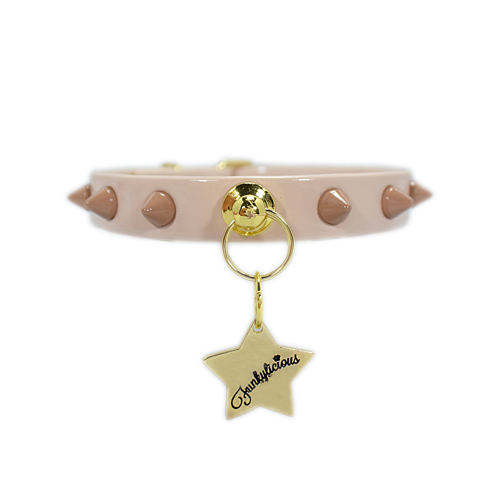 Esta realizado en tira de charol de 13mm con remaches punk acrílicos que no pesan nada y muy seguros.