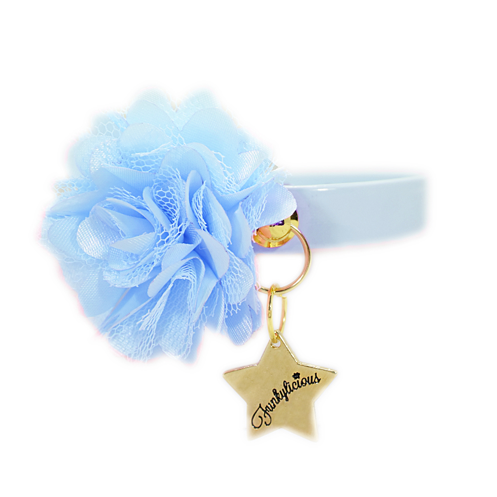 El collar Flower azul Funkylicious está realizado en charol de 13mm con un adorno en forma de flor de satén.