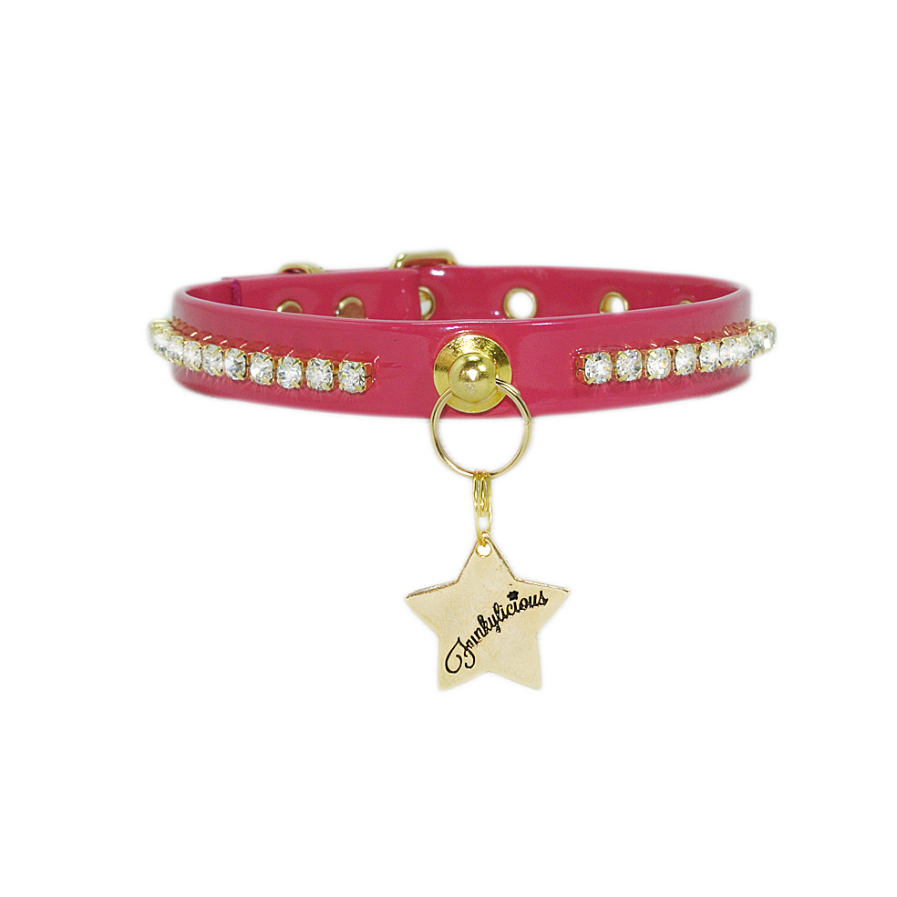 El collar Luxury Party de Funkylicious está realizado en charol de 13mm decorado con strass cosidos a mano. Para que los principes y princesas de la casa brillen con luz propia.