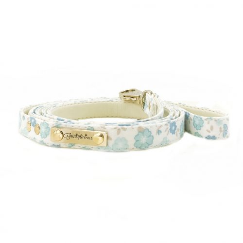 La correa Blossom Azul de Funkylicious realizada tela y eco-piel cosida de 12 mm x 1.40 m de largo. A juego con los collares y arneses Blossom.