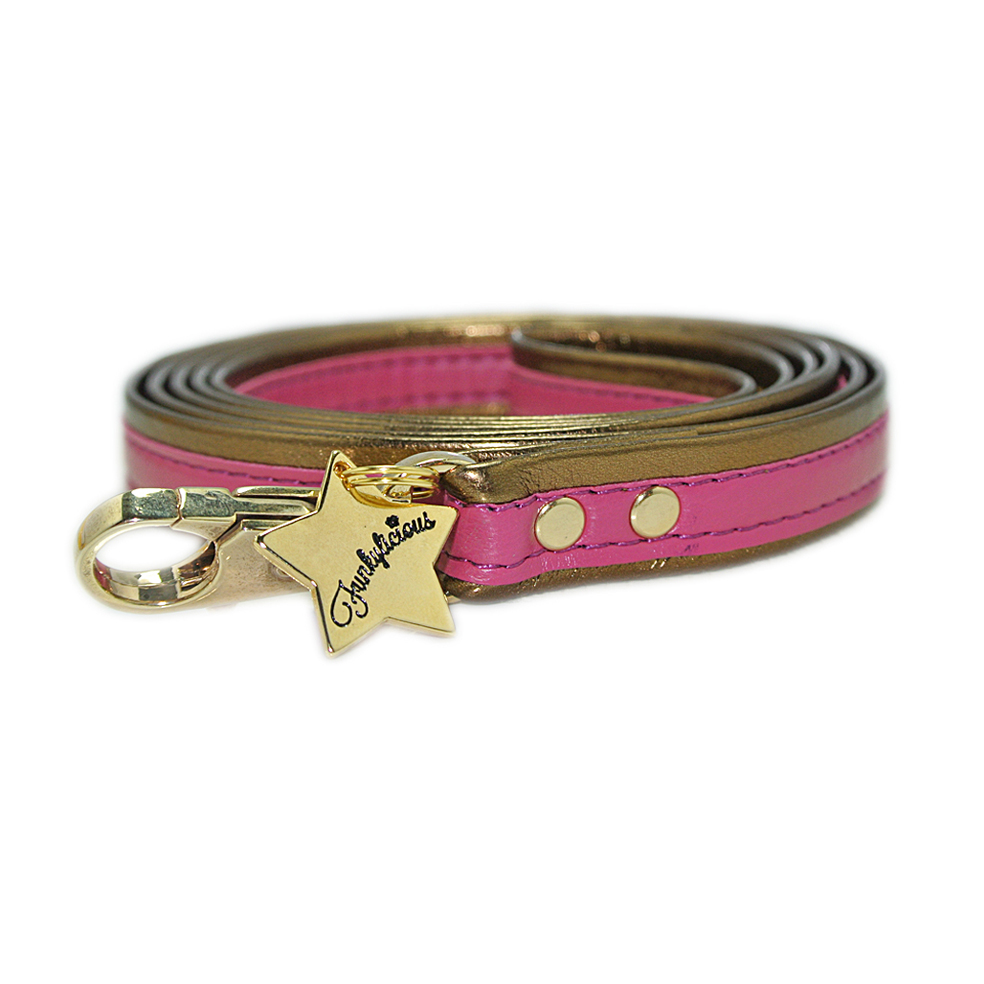 La correa Sherezade Fucsia de Funkylicious realizada en dos tipos de eco-piel cosidos, símil cuero en la parte inferior y símil napa en la parte superior. A juego con el arnés Sherezade Turquesa y el collar Sherezade Turquesa. Inspirado en los colores del lejano oriente.