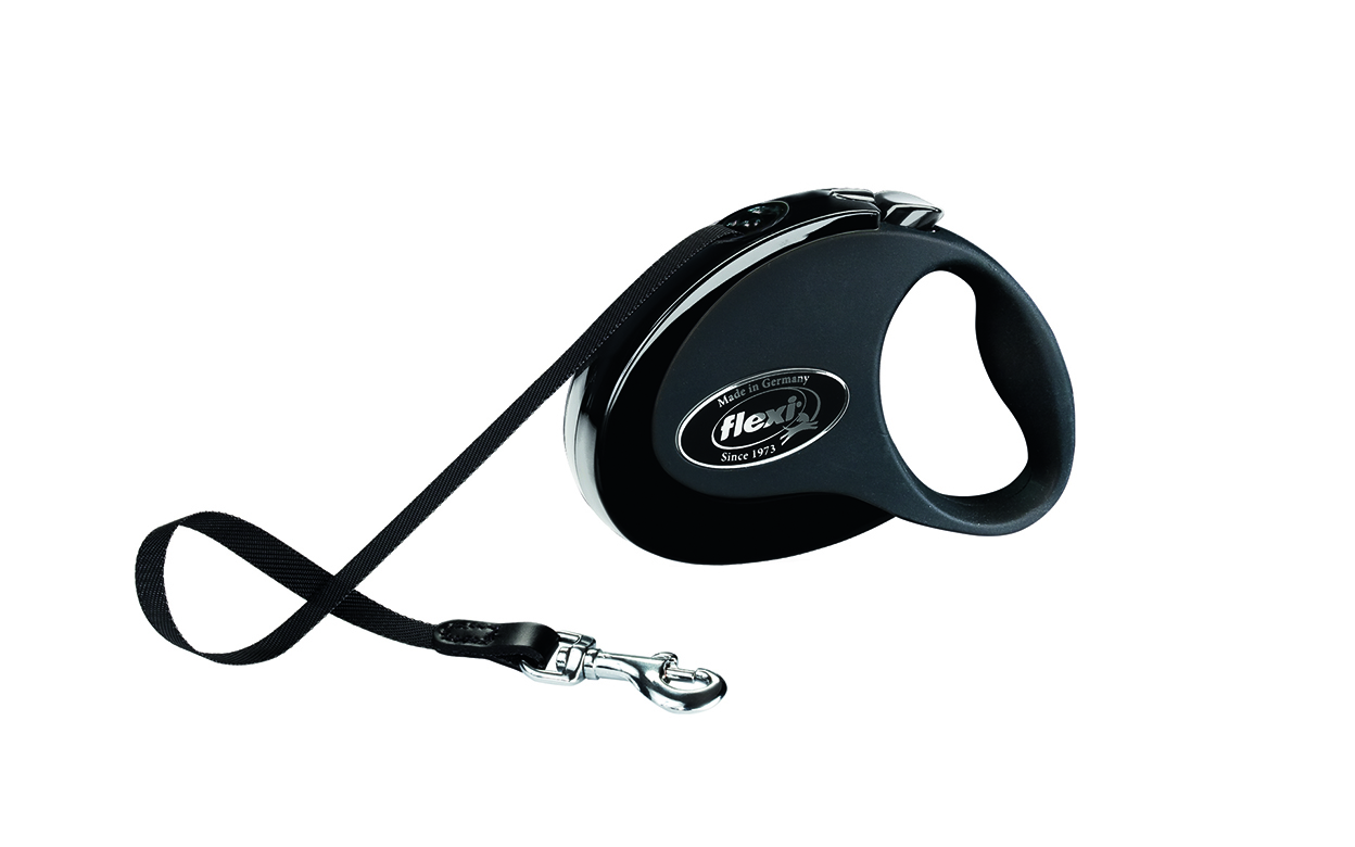 Correa Flexi de cinta en color negro de 3 m. Para perros de hasta máx. 12 kg. Formato de bolsillo. Asa blanda. Gancho cromado.