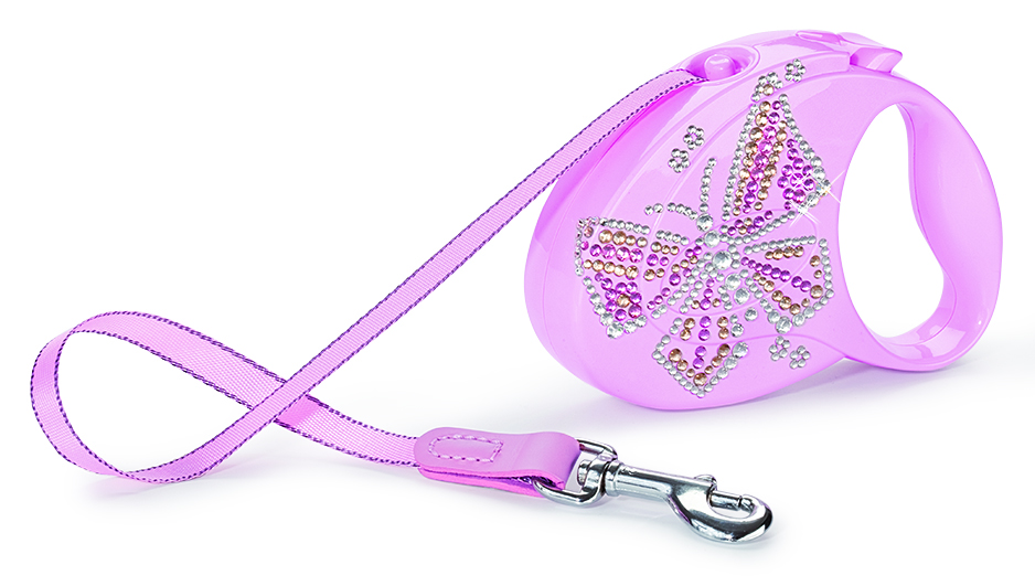 Correa Flexi de cinta en color rosa de 3 m.Para perros de hasta máx. 12 kg. Carcasa con pintura de laca al brillo, ennoblecida con cristales SWAROVSKI® ELEMENTS haciendo el dibujo de una mariposa. Formato de bolsillo. Cinta con elegante guarnición de cuero. Gancho cromado.