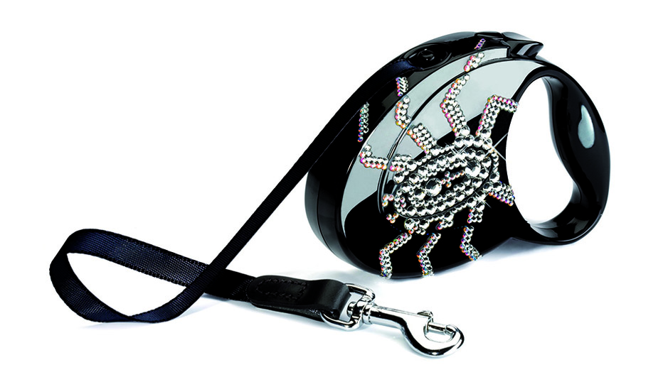 Correa Flexi de cinta en color negro de 3 m.Para perros de hasta máx. 12 kg. Carcasa con pintura de laca al brillo, ennoblecida con cristales SWAROVSKI® ELEMENTS. Formato de bolsillo. Cinta con elegante guarnición de cuero. Gancho cromado.