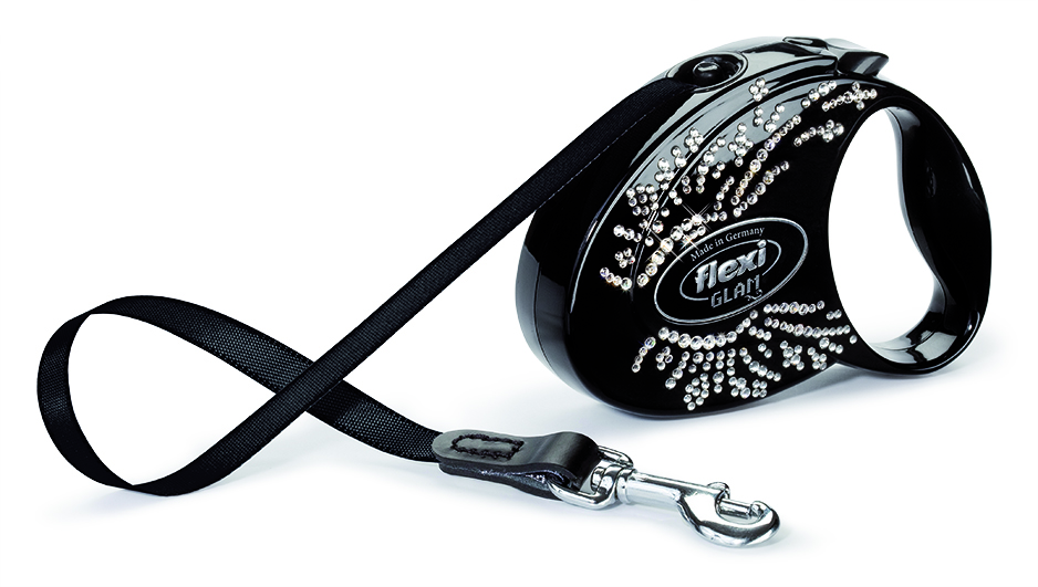 Correa Flexi de cinta en color negro de 3 m.Para perros de hasta máx. 12 kg. Carcasa con pintura de laca al brillo, ennoblecida con cristales SWAROVSKI® ELEMENTS. Formato de bolsillo. Cinta con elegante guarnición de cuero. Gancho cromado.