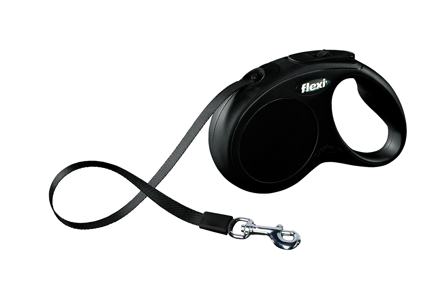 Correa Flexi de cinta en color negro de 5 m. Para perros de hasta máx.15 kg. Sistema de cómodo frenado. Gancho cromado. Compatibles con accesorios LED Lighting System. Compatibles con accesorios Multi Box.