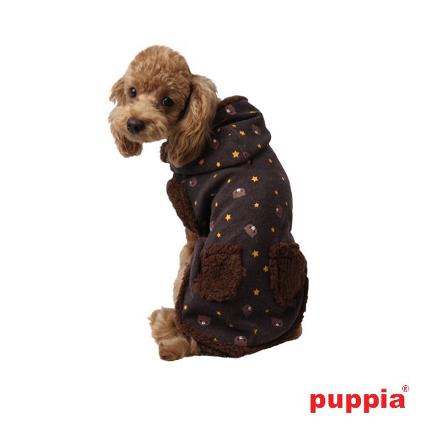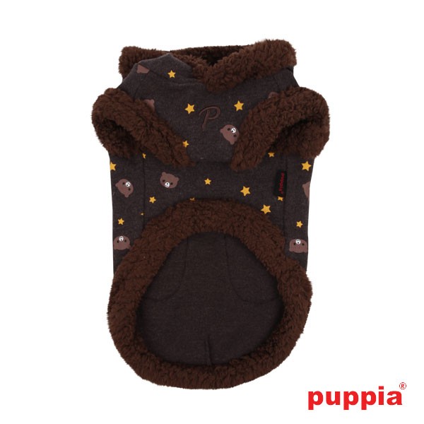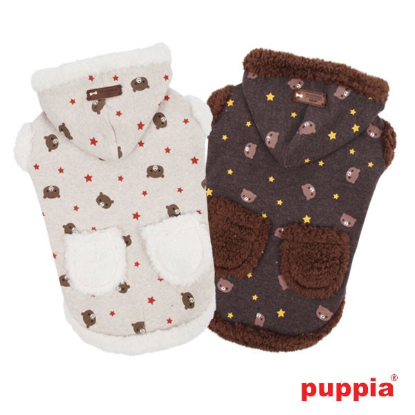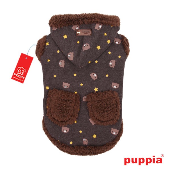 Preciosa sudadera de la marca Puppia con estampado de ositos y estrellitas. Tiene forro polar, para que no pase frío durante los días de frio. Tiene capucha y dos bolsillos hechos con la misma tela que el forro de la sudadera. Tiene un agujero para pasar la correa. Está decorado con el emblema de Puppia Luxury.