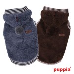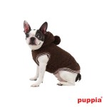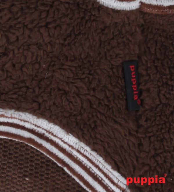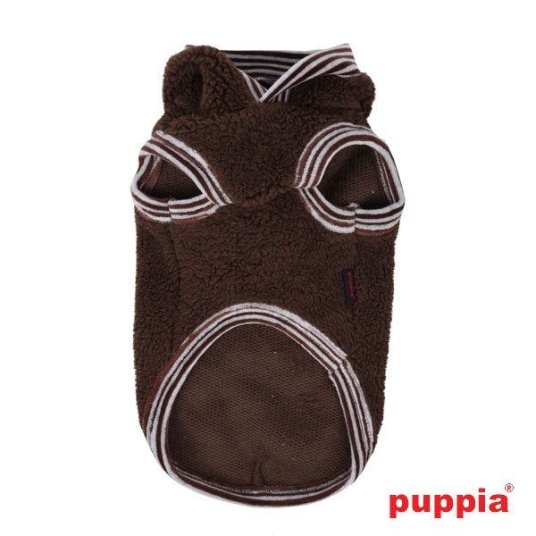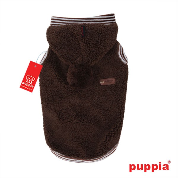 Sudadera de la marca Puppia de color marrón. De lana para que no pase frío durante los días de invierno. Tiene capucha con un pompon. Tiene un agujero para pasar la correa. Está decorado con el emblema de Puppia Luxury.